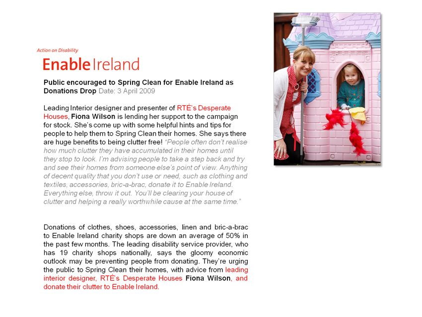 Fiona has appeared as VIP evenings for "The House of Fraser" one of Dublin's most exclusive department stores to promote interior design. She has also represented "Enable Ireland" in order to help raise awareness for the charity.